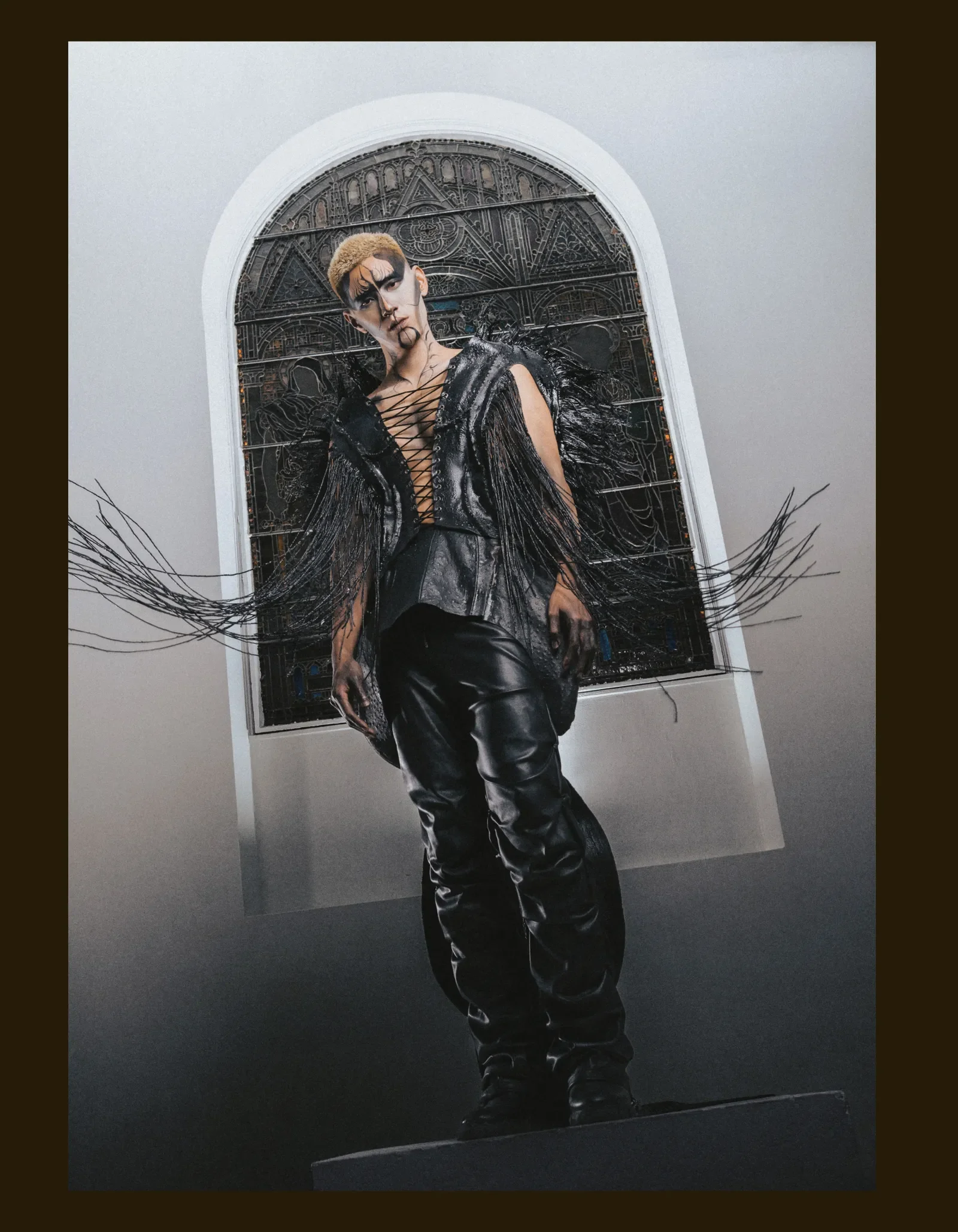 Kai Wang, Model & Drag artist wears the Devobula jacket and skirt from the Thesis Zenith Collection. I had to honor of also being his personal makeup artist for the evening and shoot.